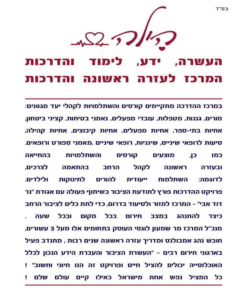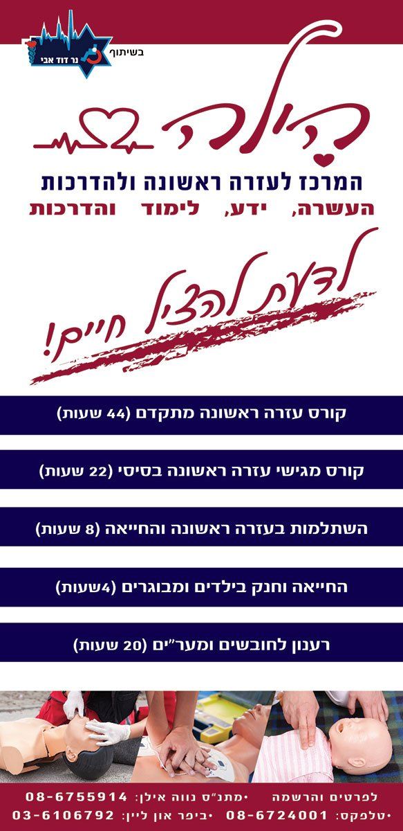 קורס 44 שעות, קורס 22 שעות למטפלות ולחינוך גופני, קורס 9 שעות למעונות, קורס 4 שעות אזרחים, קורסי החייאה במבוגרים ובילדים, קורס שימוש והפעלת דפיברילטור.